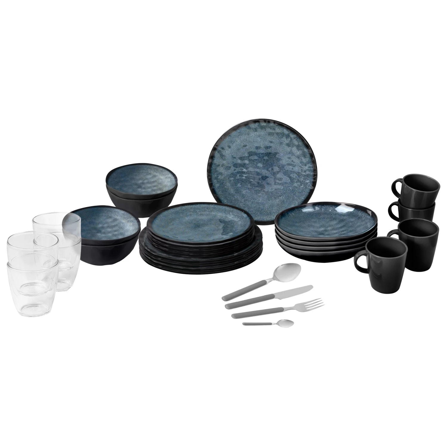 - assiettes: 4 grands de 26 cm, 4 petites de 21 cm, 4 creuses de 21 cm; bols: 4 de 15 cm; tasses: 4 de 30 cl; verres: 4 de 20 cl; kit de couverts: 4 couteaux, 4 fourchettes, 4 grandes cuillères, 4 petites cuillères